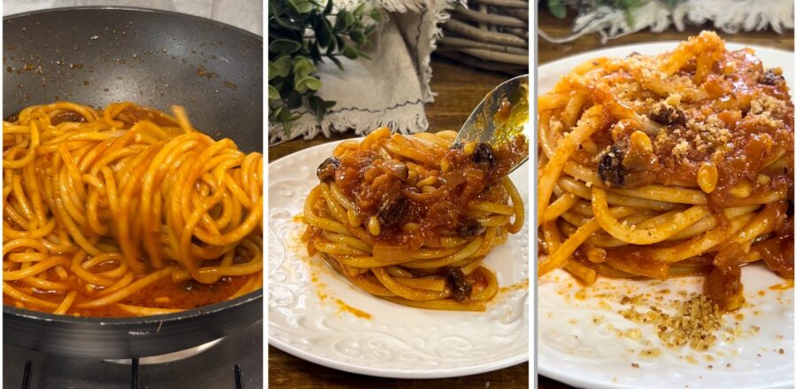 Als goede Siciliaanse die ik ben, houd ik van typische gerechten en natuurlijk behoort pasta c’anciova daartoe. Van pasta met sardines en venkel, tot de Siciliaanse melanzane-caponata, via de Sarde a beccafico à la Catania en de arancini, in Sicilië is smaak altijd heer en meester! Pasta c’anciovi e muddica atturrata doet daar niet voor onder tussen de vele traditionele gerechten die je in mijn prachtige regio kunt proeven. Maar wat is “pasta c’anciova”? De pasta met ansjovis is een heel eenvoudig gerecht uit de traditionele Siciliaanse keuken en meer specifiek uit de Palermitaanse keuken. Het wordt bereid met een saus op basis van ansjovis, pijnboompitten, rozijnen en tomatenconcentraat. Een recept van uitzonderlijke heerlijkheid, dat nog verrukkelijker wordt door de toevoeging van geroosterde paneermeel, oftewel de “muddica atturrata”, door iedereen gekend als de geraspte kaas van de armen. Laten we nu naar de keuken gaan en samen het recept van pasta c’anciova e muddica atturrata bereiden — wat zal dat lekker zijn! Maar voordat je naar de keuken rent, herinner ik je eraan dat je, als je op de hoogte wilt blijven van al mijn andere recepten, mijn Facebookpagina en mijn Instagramprofiel kunt volgen.