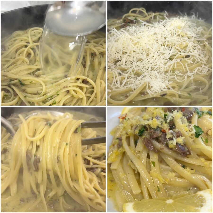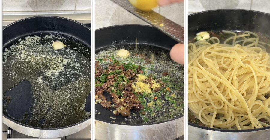 de boter in de pan, voeg een heel teentje knoflook toe en zodra het begint te sissen voeg je de olijven, de peterselie, de citroenschil en wat peperoncino toe. Laat een minuutje opwarmen en voeg de nog al dente uitgelekte pasta toe.