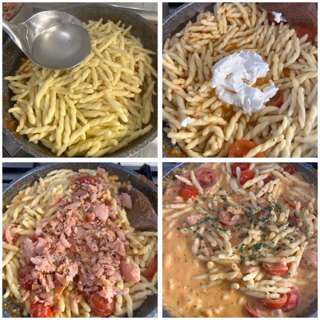 • Schep de pasta, nog beetgaar, met een schuimspaan uit het kookwater en voeg deze toe aan de tomatensaus in de pan. Maak op smaak en romig met wat pastawater en robiola (je kunt de kaas weglaten als je geen romige kazen wilt) en voeg tenslotte de zalm toe.