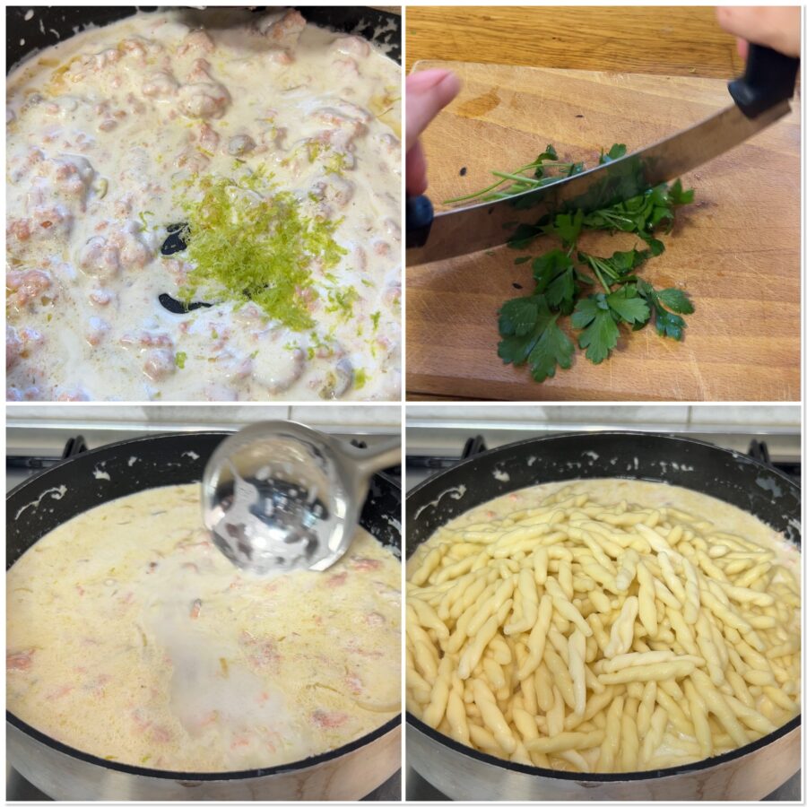 Voeg de room toe buiten het vuur en rasp nog wat citroen erboven, hak de peterselie en zet die even apart. Schep de pasta, die nog beetgaar is, op met een schuimlepel en giet deze bij de saus, die je eerder hebt aangelengd met wat kookwater van de pasta.