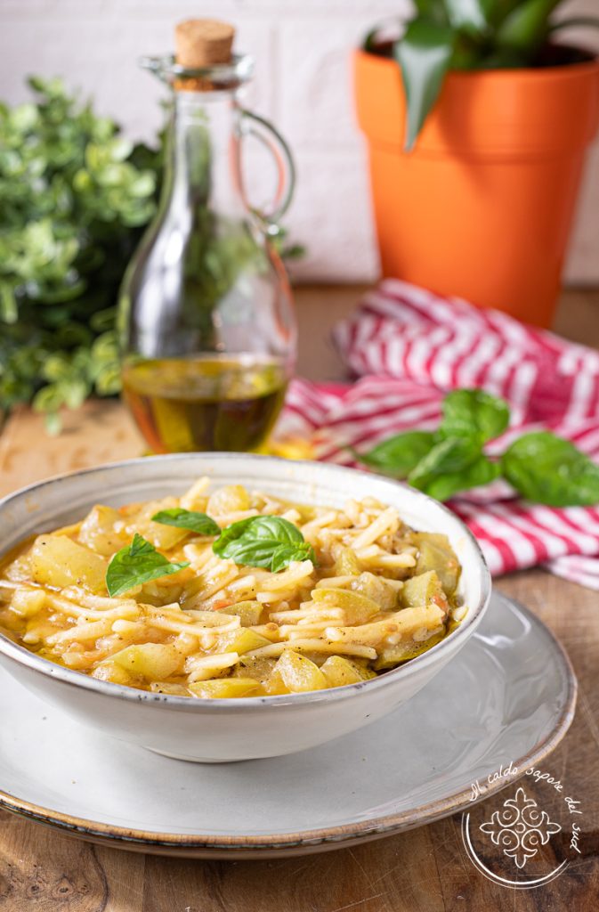 Pasta met lange courgette en aardappelen, de Siciliaanse zomersoep met gebroken pasta en lange courgette. Een gerecht dat even eenvoudig als smaakvol is, dat deel uitmaakt van de Siciliaanse keuken en oma’s recepten en een traditioneel recept dat mij persoonlijk terugbrengt naar de zomers in Pedara met mijn grootmoeder van moederskant. Toen ik een kind was, hield mijn grootvader Carmelo er in ons landhuis van om de lange courgettes te telen — ook wel pergola-courgettes genoemd — die heel smal en lang zijn en lichtgroene kleur hebben, hetzelfde type waarvan ook de tenerumi van de plant worden geoogst. Oma maakte met deze courgettes de soep van courgette, aardappel en tomaat, en wanneer we die niet aten met huisgemaakt brood, maakte ze er ook een heerlijke romige pasta van. Natuurlijk, toen was pasta met courgette en aardappelen — perfect voor een vegan of vegetarische maaltijd — niet mijn favoriete lunch, maar nu de jaren zijn gegaan en de grootouders er niet meer zijn, brengt deze soep mij terug naar de late zomermiddagen, de zonsondergangen en de geuren van een keuken die nu in herinnering is vervaagd. Typisch voor de zomer, hoewel het een warm gerecht is, geeft deze soep met pasta, courgette en aardappelen veel voordelen: niet alleen vitamines en vezels, maar ook vocht en mineralen — een echte weldaad om te proberen. Oma maakte het nog lekkerder door aan het einde van de bereiding een flinke hand Parmezaanse kaas of Grana Padano toe te voegen.