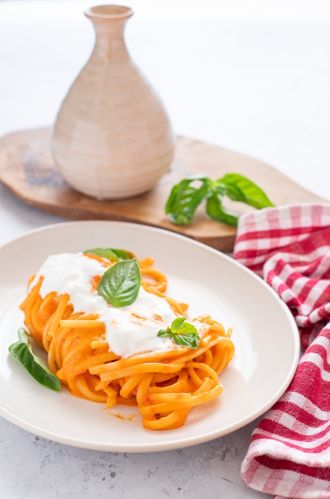 Pasta met paprikacrème en burrata, of beter gezegd pasta met paprikacrème en stracciatella, een zomers voorgerecht dat snel, makkelijk en verrukkelijk is, perfect om thuis of met vrienden te eten. Kleurig, vlezig en aromatisch, paprika’s behoren tot de meest gewaardeerde en smakelijke zomergewassen, veelzijdig en goedkoop, ze laten zich bereiden op duizend manieren, van de eenvoudigste tot de meest bijzondere. Vandaag heb ik met paprika’s bedacht een romig en delicaat gerecht dat ik heb verrijkt met stracciatella, zodat je een eenvoudig en origineel recept krijgt dat perfect is om een heerlijk zomers pastagerecht op tafel te zetten. In de zomer maak ik graag recepten met paprika’s, van bijgerechten tot voorgerechten, en hoofdgerechten, en vandaag zal ik je vertellen hoe je pasta met paprikacrème maakt; je hebt er maar een paar ingrediënten voor nodig, maar ze geven een uitstekend resultaat.