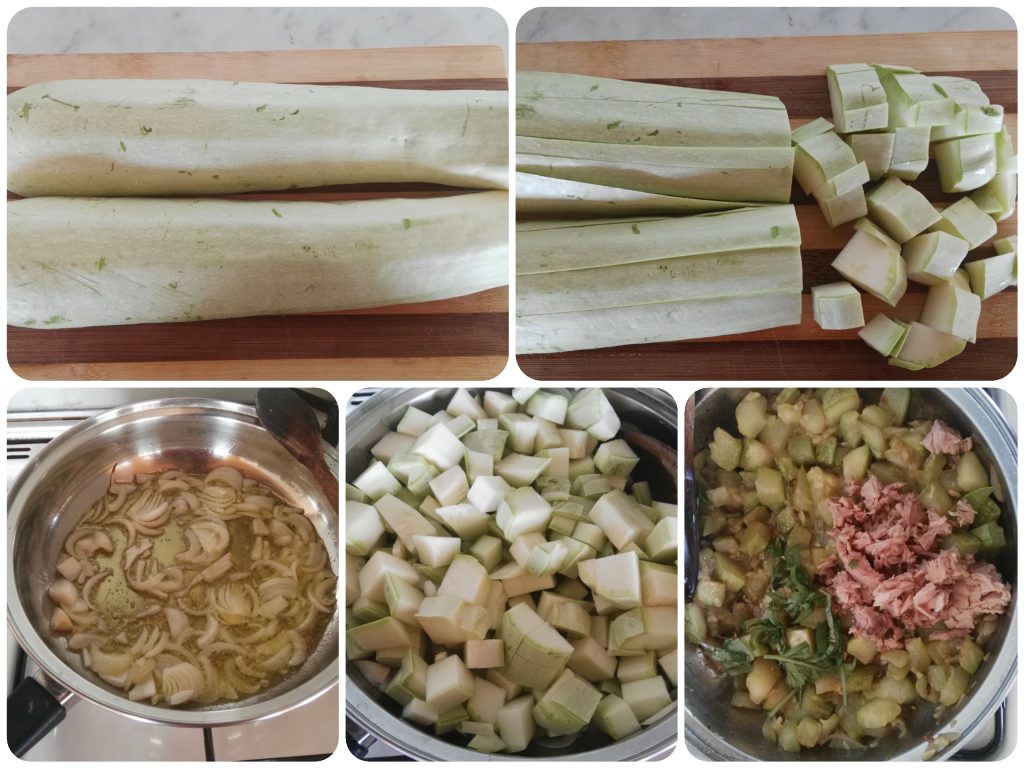 Snijd de courgette in blokjes, fruit een ui in ruime hoeveelheid olie; zodra deze begint te kleuren voeg je de courgette toe, breng op smaak met zout en laat op hoog vuur koken — dit duurt ongeveer twintig minuten.