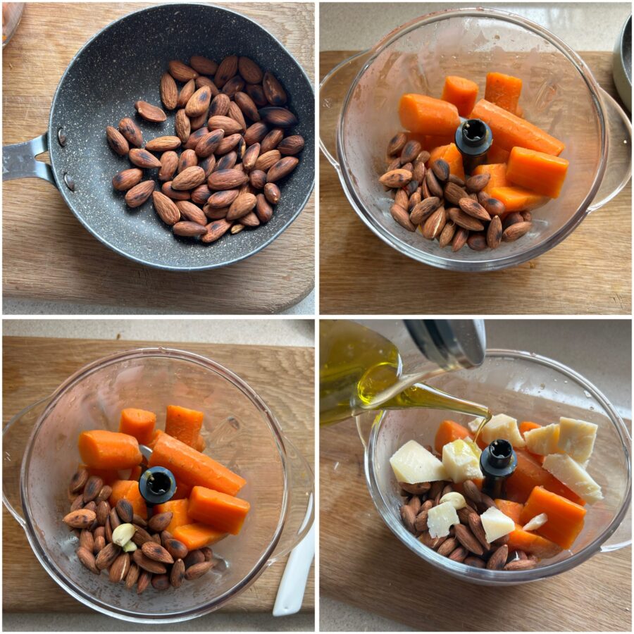 • Rooster ondertussen de amandelen 2–3 minuten in een antiaanbakkoekenpan, regelmatig roerend om verbranden te voorkomen. Doe de gekookte wortelen, de geroosterde amandelen, een teentje knoflook, de Parmezaan en de Pecorino in stukjes in de blender.