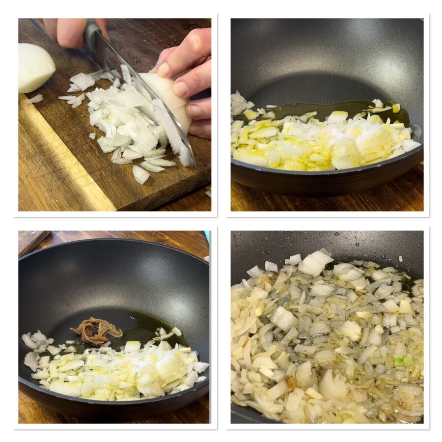 Om deze heerlijke pasta te maken, begin je met het schillen en fijnhakken van een ui, roerbak deze glazig in een royale scheut olie samen met de ansjovisfilets. Als de ui zacht is en de ansjovis is opgelost, voeg je de olijven toe, voor de helft gehakt en voor de helft heel.