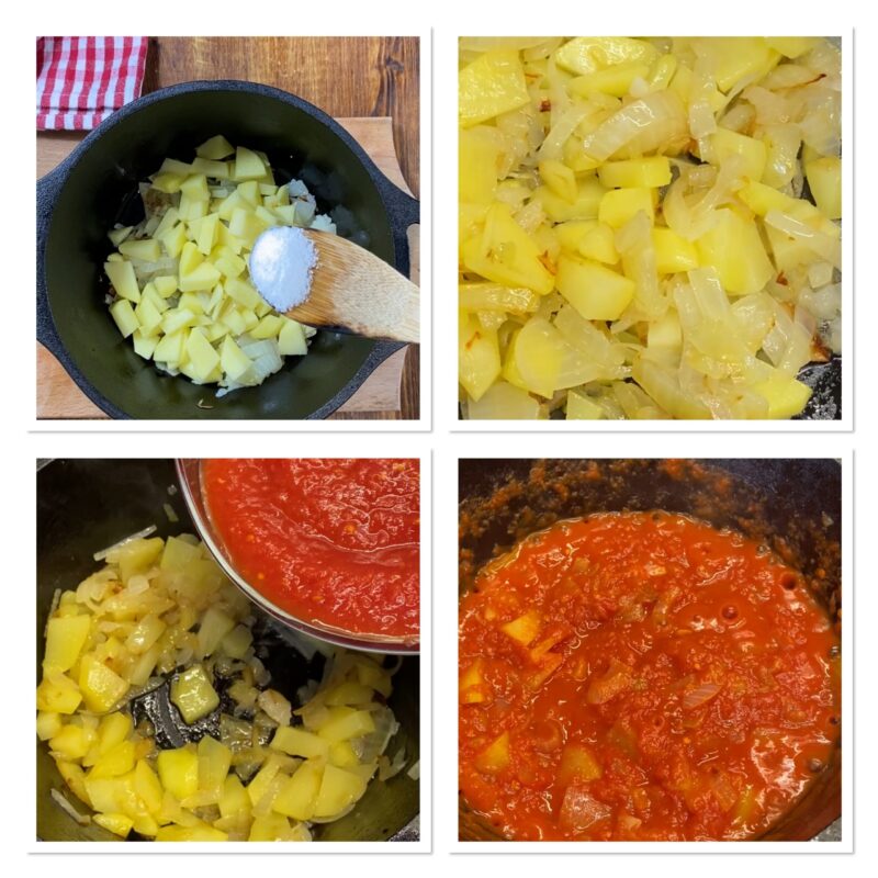 Voeg de tomatensaus toe die je hebt verkregen door de gepelde tomaten of de stukken te pureren en kook totdat de aardappelen bijna gaar zijn.