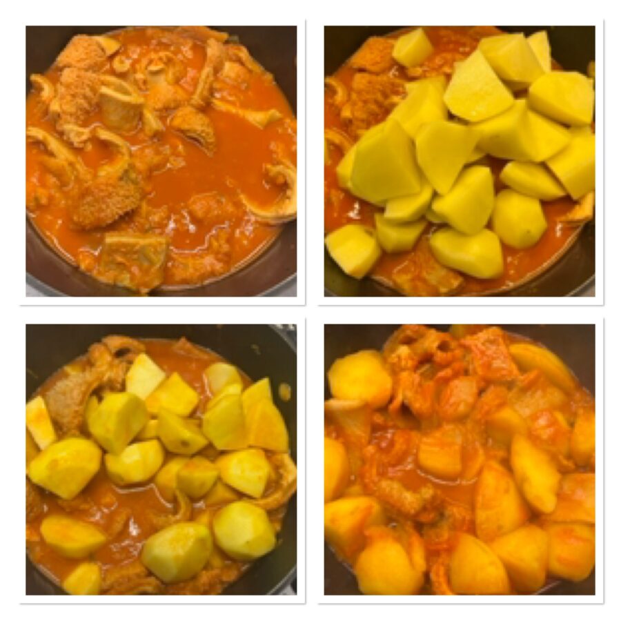 • Als de pens zacht is, voeg je de gewassen, geschild en in grove stukken gesneden aardappelen toe en indien nodig nog wat water.