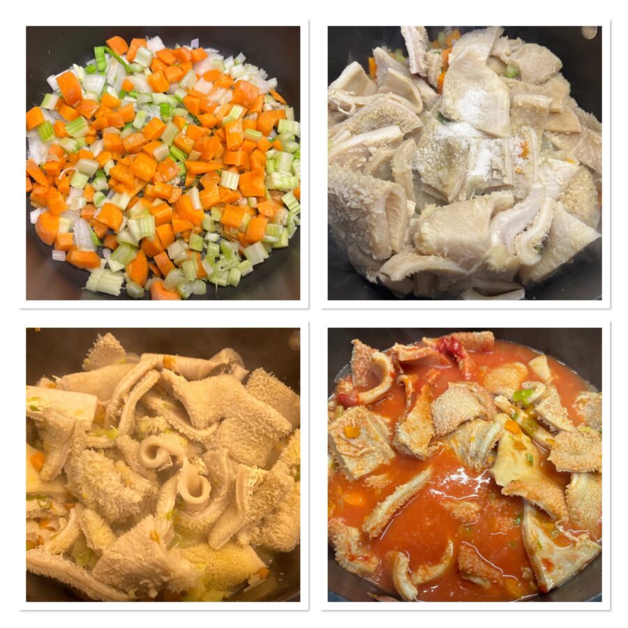 • Als de pens klaar is en onder stromend water is afgespoeld, was en schil je de groenten en snijd je ze in kleine stukjes. Laat ze even zacht worden op hoog vuur met een flinke scheut olie, voeg de pens en zout toe en bak enkele minuten (als je wilt, voeg een half glas witte wijn toe en blus af). Voeg de passata van tomaat, de chilivlokken, een vol glas water toe en laat met deksel op laag vuur sudderen gedurende 90 minuten tot twee uur, en voeg indien nodig extra water toe.