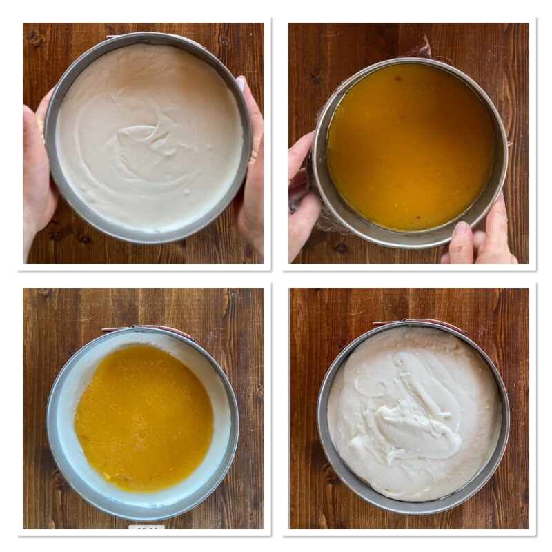 Open de vorm met de perzikcompote en gebruik dezelfde huishoudfolie om de gelei te verplaatsen en om te keren in het midden van de cheesecake.