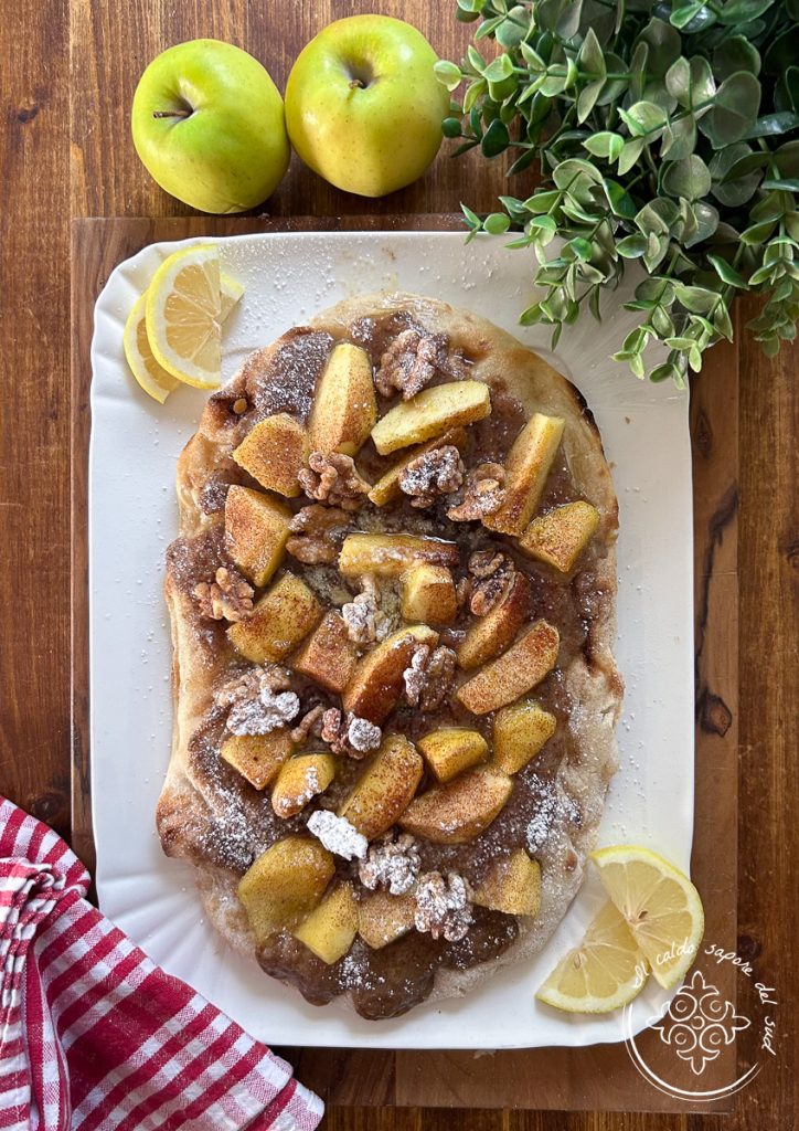 Zoete pinsa met appels, de zoete versie van de beroemde Romeinse pinsa. De Romeinse pinsa is een gerezen bakspecialiteit die typisch is voor de Romeinse keuken. Het is een deeg dat anders is dan gebruikelijk, gemaakt van een mix van verschillende meelsoorten die, naast tarwemeel, ook rijst- en sojameel bevat. Dankzij de bijzondere verwerking levert dit een eindproduct op met een dubbele structuur: tegelijk knapperig en zacht. De pinsa doet denken aan zowel brood als focaccia en, omdat het een eenvoudige basis is zoals pizza, kan het op duizend manieren worden belegd. Meestal kiest men hartige vullingen, zoals Pinsa met vier kazen of Pinsa alla parmigiana. Vandaag wil ik je echter een recept laten zien dat de pinsa omtovert tot een fantastisch herfstig dessert, perfect te rekenen tot de Desserts met appels die we zo graag hebben: we maken een pinsa met walnotenjam, gekarameliseerde appels, honing en kaneel — een delicaat, geurig en overheerlijk dessert dat je bij de eerste hap zult beminnen! Klaar? Snel naar de keuken, dit dessert is in slechts 10 minuten klaar en zal je verrassen. En zoals altijd, als je op de hoogte wilt blijven van al mijn recepten, volg dan mijn Facebookpagina (hier) en mijn Instagramprofiel (hier).