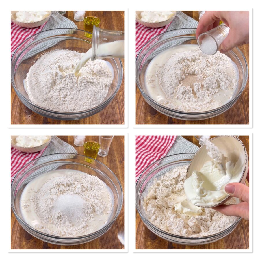 Giet in de kom de bloem, een deel van de lauwe melk, de gist en de suiker en meng zodat alles goed oplost. Voeg de yoghurt toe,