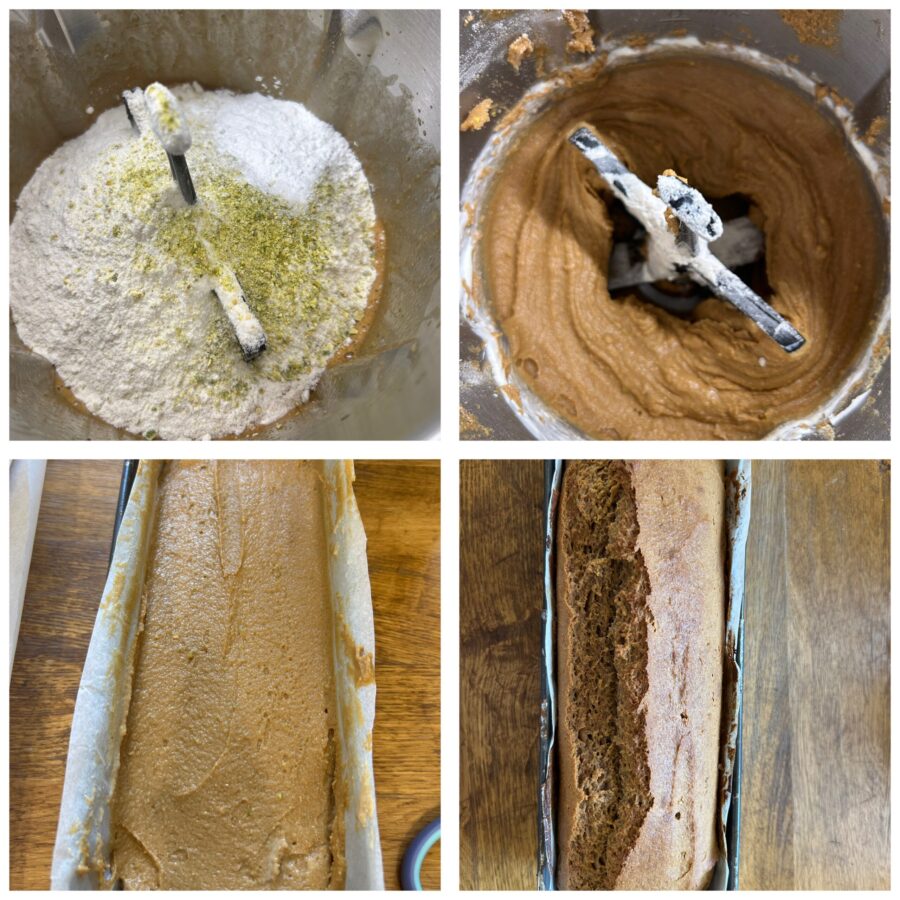 Voeg ook wat geraspte citroenschil toe (of gedroogd en fijngehakt zoals de mijne) en mix nog een paar minuten totdat je een romig beslag krijgt. Het deeg zal redelijk stevig zijn, maar maak je geen zorgen — dat is normaal. Verdeel het beslag over een met bakpapier bekleed plumcakeblik en bak in een voorverwarmde heteluchtloze oven (of in statische stand) gedurende 40-45 minuten. Controleer met een satéprikker voordat je het uit de oven haalt.