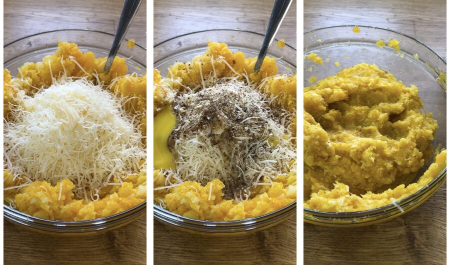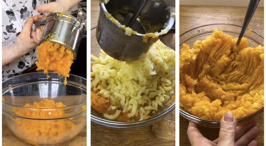 Stamp de gekookte pompoen fijn met de aardappelstamper en schep in een kom. Doe hetzelfde met de nog warme aardappelen; je hoeft ze niet te schillen, de schil blijft in de stamper zitten.