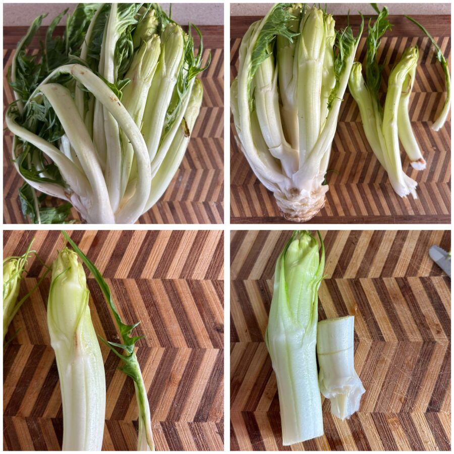 Om puntarelle alla Romana te maken, verwijder je de buitenste bladeren van de catalogna-cichorei en behoud je alleen de binnenste, lichtere en knapperige scheuten. Snijd de harde, vezelige basis van elke scheut en verwijder eventueel beschadigde delen.