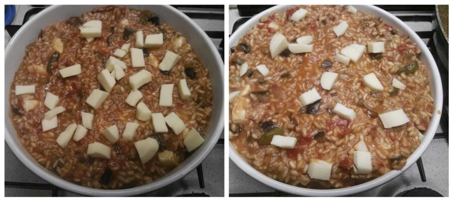 Kook bijna gaar; wanneer de rijst al dente is, breng op smaak met zout, zet het vuur uit, voeg de geraspte kaas toe, roer goed door en voeg vervolgens de helft van de provola of de gekozen zachte kaas in blokjes toe, roer nogmaals.