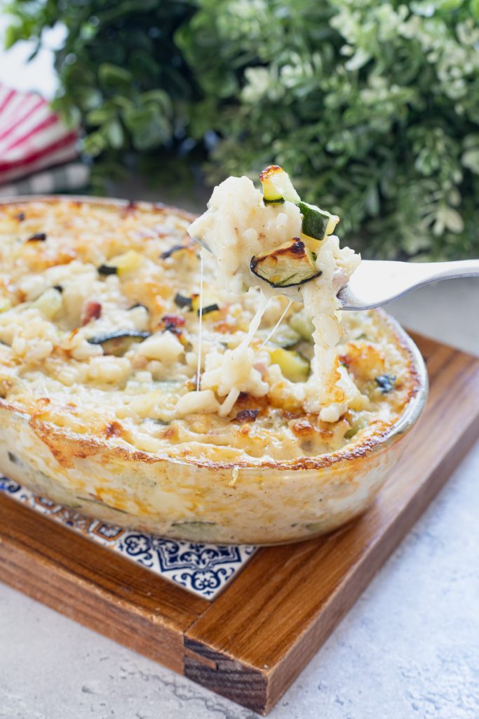 Rijstovenschotels zoals Rijst uit de oven met ragù of Rijst uit de oven met spinazie zijn de favorieten van mijn gezin; ik vind het heerlijk om ze op verschillende manieren te bereiden en vaak met seizoensgroenten. Vandaag wil ik daarom mijn versie van rijst uit de oven met courgette en pancetta met jullie delen. Een recept vol smaak en super smeuïg, perfect voor een fantastisch zomers risotto dat ook lauw lekker is, maar ook een gerecht geschikt voor de lente en grote picknicks. Een heel eenvoudige en snelle bereiding, ideaal om het hele gezin blij te maken zonder veel moeite en dat in een seconde van de tafel zal verdwijnen!!