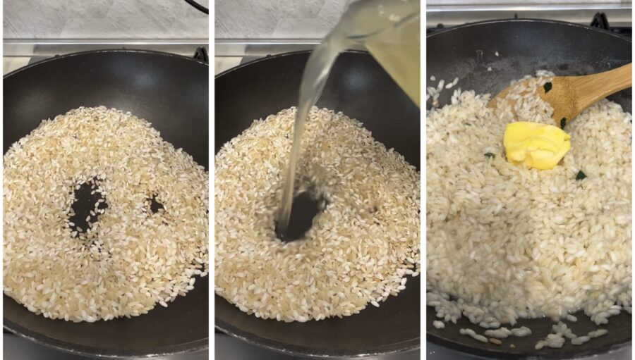 Rooster de rijst in de pan en kook deze tot hij beetgaar is, voeg de boter toe, roer en voeg de spinazie en 1/3 van de geraspte kaas toe.