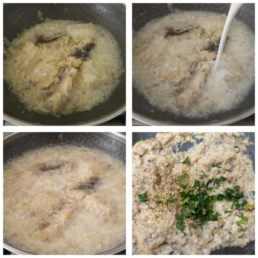 Giet de warme melk erbij totdat de baccalà net onderstaat.