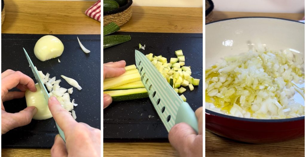 Om de romige pasta met courgette en pancetta te maken, begin met het pellen en fijnhakken van de ui, vervolgens de courgettes schoonmaken en in kleine blokjes snijden. Laat de ui glazig worden in een flinke scheut olie,