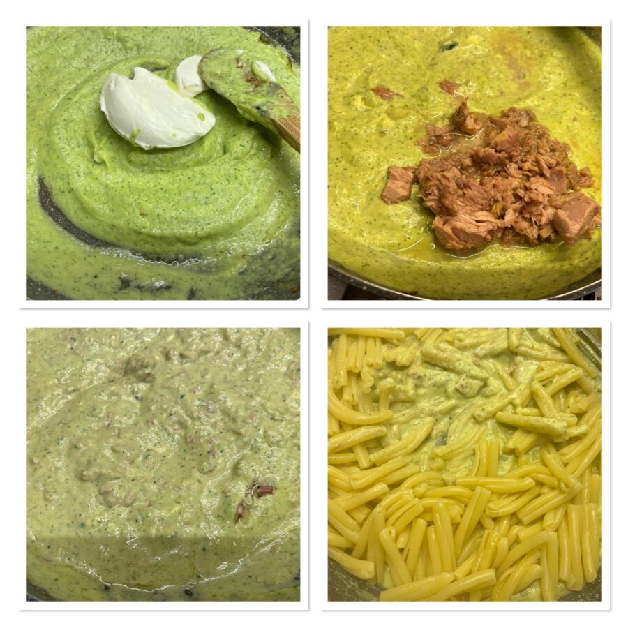 Schep de crème terug in de pan waarin je de courgettes hebt gekookt, voeg met het vuur uitgeschakeld de kaas toe en meng goed, voeg dan de uitgelekte tonijn toe.