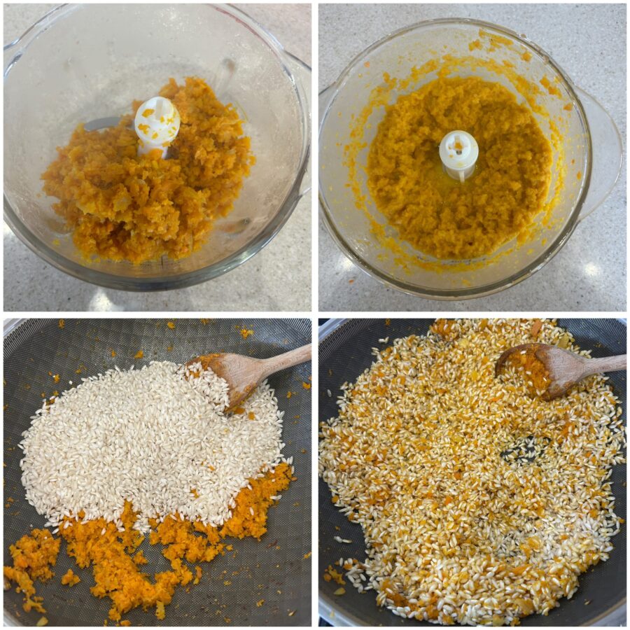 • Voeg halverwege de kooktijd de wortelcrème toe en ga door met koken, regelmatig roerend. Tegen het einde van de kooktijd voeg je kurkuma of saffraan toe – ze hebben twee verschillende aroma’s, maar beide werken goed – en zet je het vuur uit. Voeg vervolgens de boter en de geraspte Parmezaan toe. Roer krachtig totdat je een romige en goed gebonden risotto krijgt.