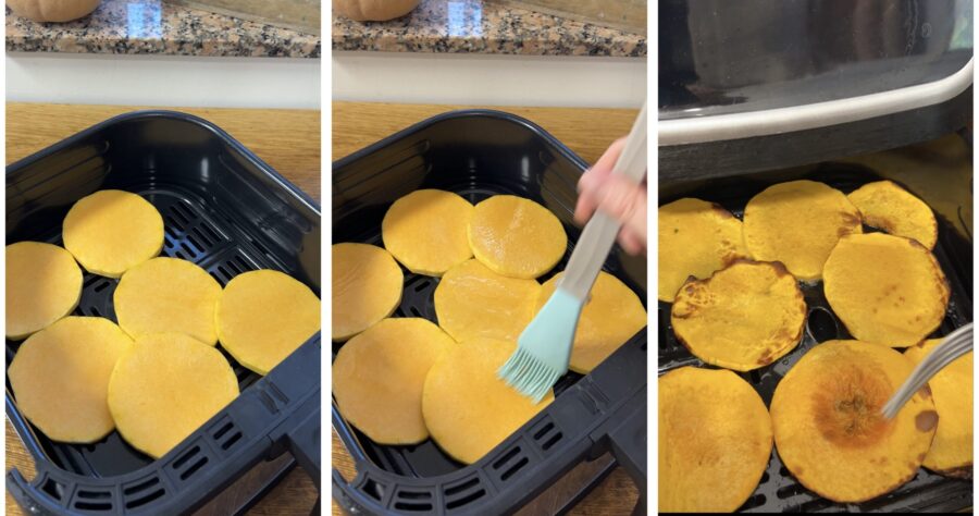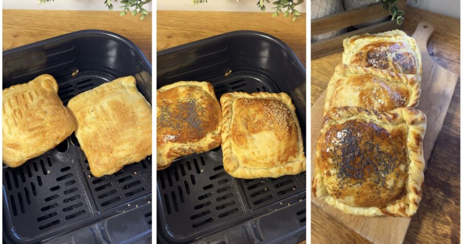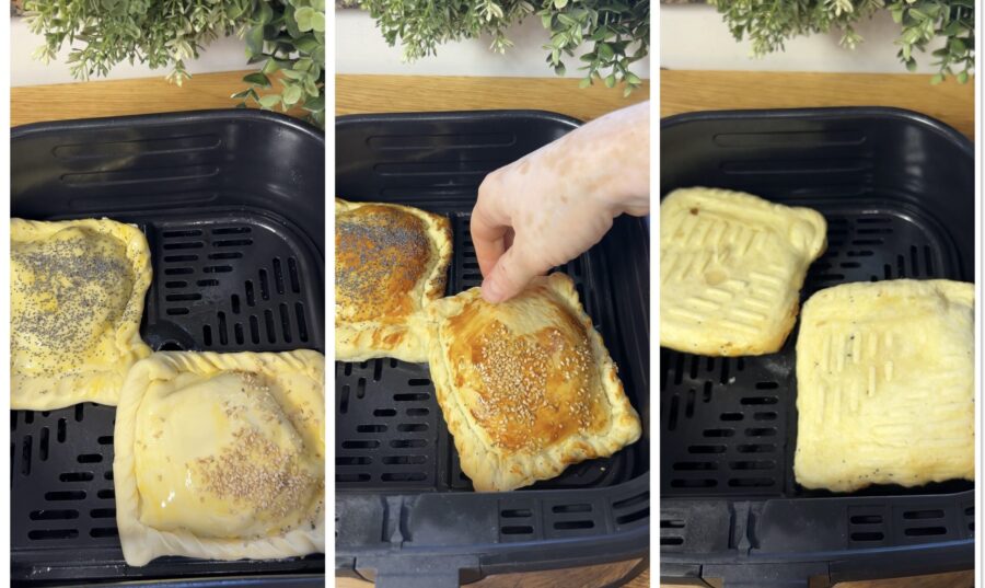 Als alternatief kun je, zoals ik, 10-12 minuten in de airfryer bakken, halverwege omkeren. Zodra de plakken goudbruin en smaakvol zijn, laat ze afkoelen en rol het eerste bladerdeegvel uit.