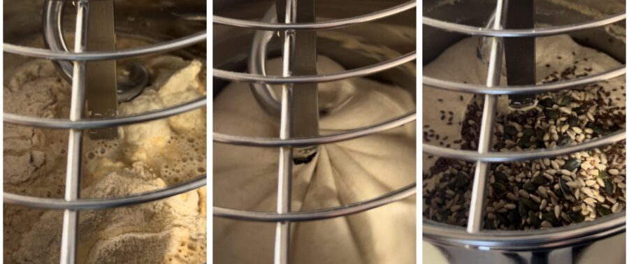 Blijf kneden totdat het deeg gevormd en perfect in het draad zit — ongeveer twintig minuten — voeg 150 g gemengde zaden toe en werk deze door het deeg.