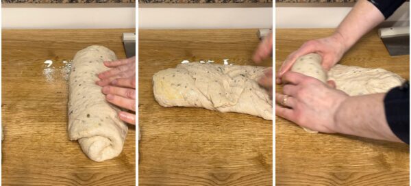 Na de rijstijd verdeel je het deeg volgens de inhoud van de rijsmanden en begin je met het vouwen. Ik heb twee manden van 1 kg gebruikt en het deeg in tweeën gedeeld. Spreid het deeg op het werkvlak tot een rechthoek en rol het op zichzelf zodat er een cilinder ontstaat.