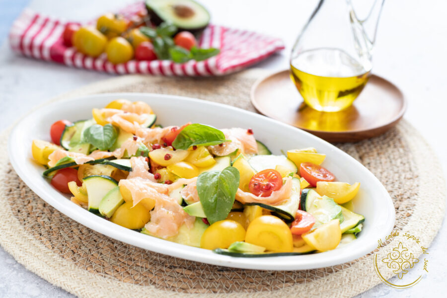 Salade van rauwe courgette met gerookte zalm, avocado en gele en rode tomaatjes…