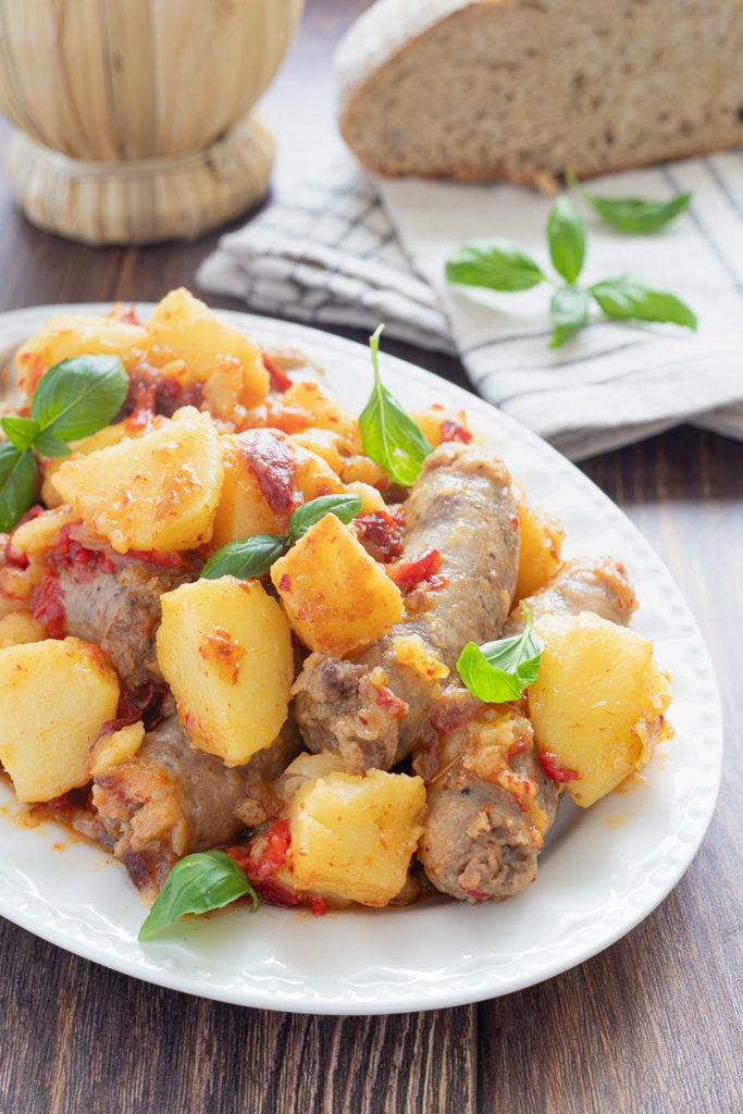 Bereiding van salsiccia in de pan met aardappelen en paprika’s