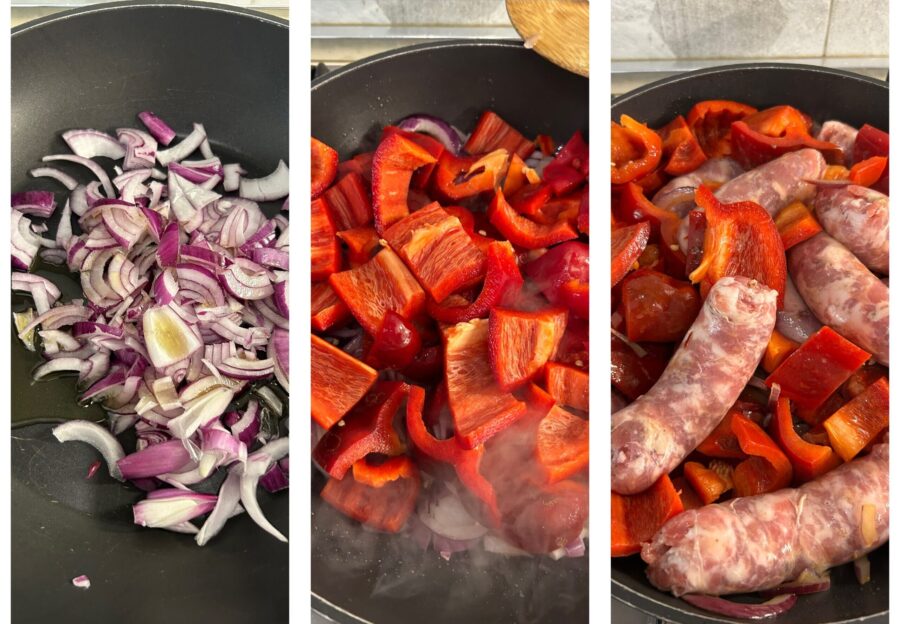 Om de salsiccia in de pan met paprika te bereiden, begin je met het pellen en in plakjes snijden van de ui. Doe de ui in een koekenpan met een scheutje olie en laat deze zacht worden op matig vuur. Spoel ondertussen de paprika’s af, verwijder de steelaanzet, de zaadjes en de binnenste draden, snijd ze in blokjes en voeg ze bij de uien. Laat alles even meebakken zodat de smaken vrijkomen en voeg daarna de salsiccia (Italiaanse worst) toe.
