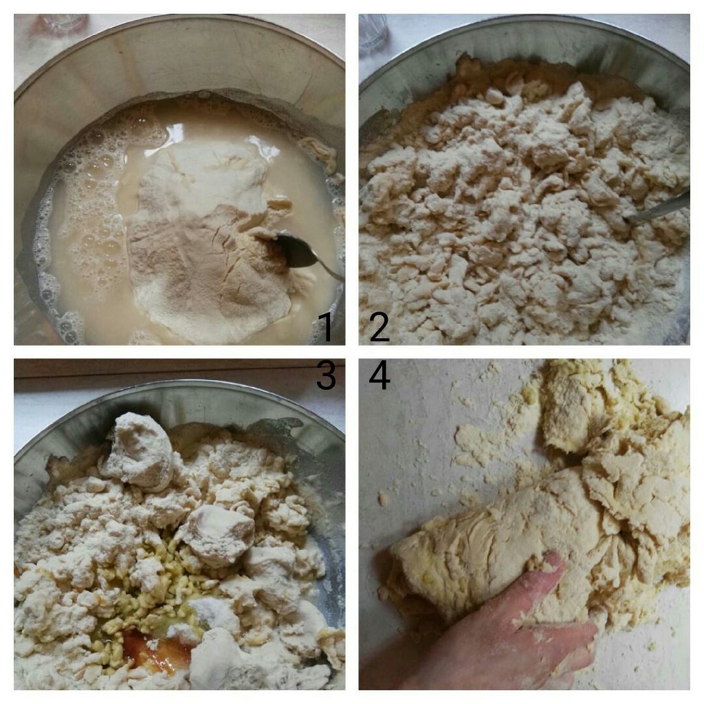 Doe de bloem in een kom en voeg bijna al het water toe. Meng grof en dek af, laat het mengsel 15 minuten rusten (autolyse). Na die tijd voeg je de in stukjes gescheurde zuurdesem toe, de olie, de moutstroop, het zout met de rest van het water en begin je te kneden; het deeg zal vanaf het begin stroef aanvoelen omdat het droog is.