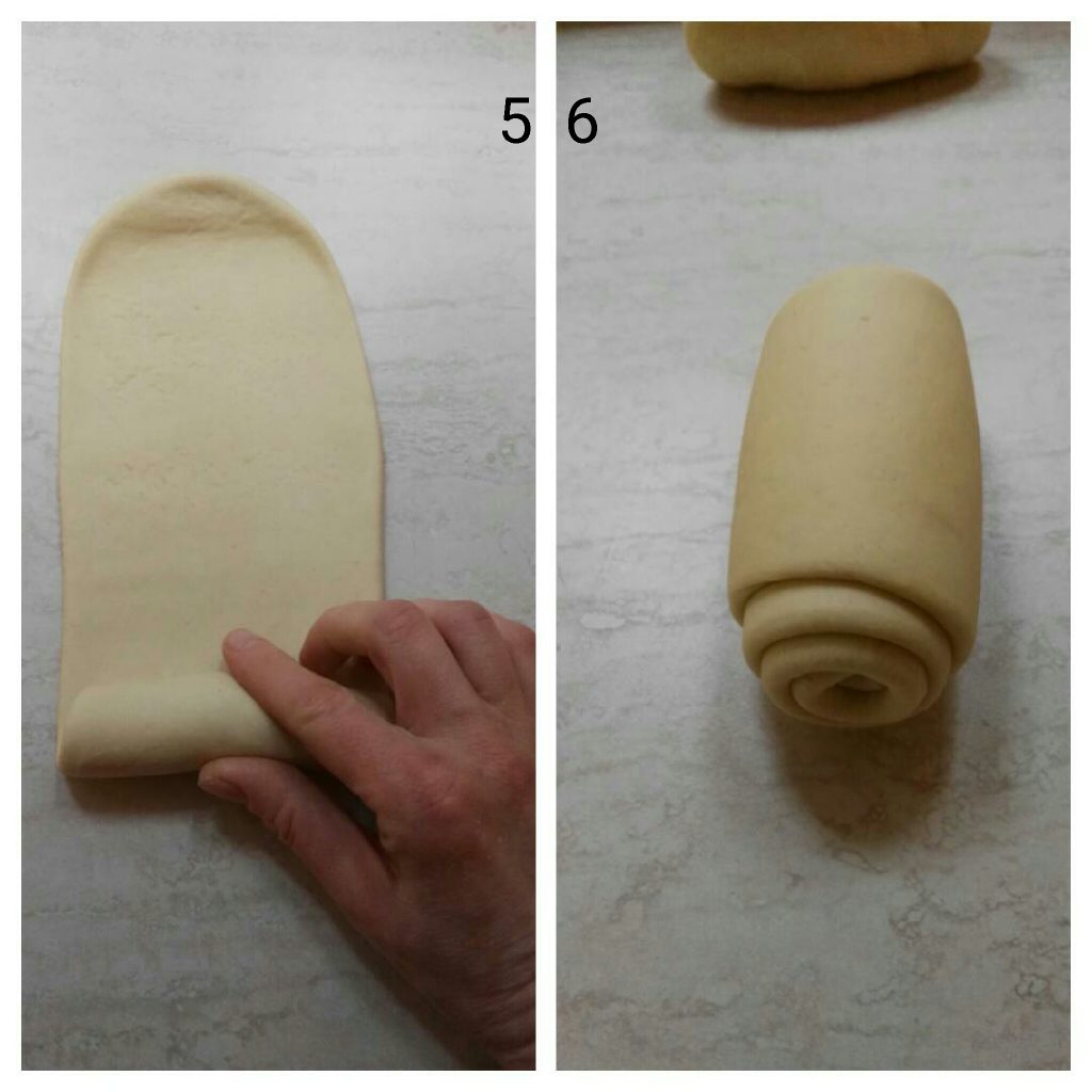 rol hem opnieuw in de lengterichting uit zodat je weer een strook krijgt zoals de vorige en rol hem vervolgens opnieuw op. Zo vorm je het brood.