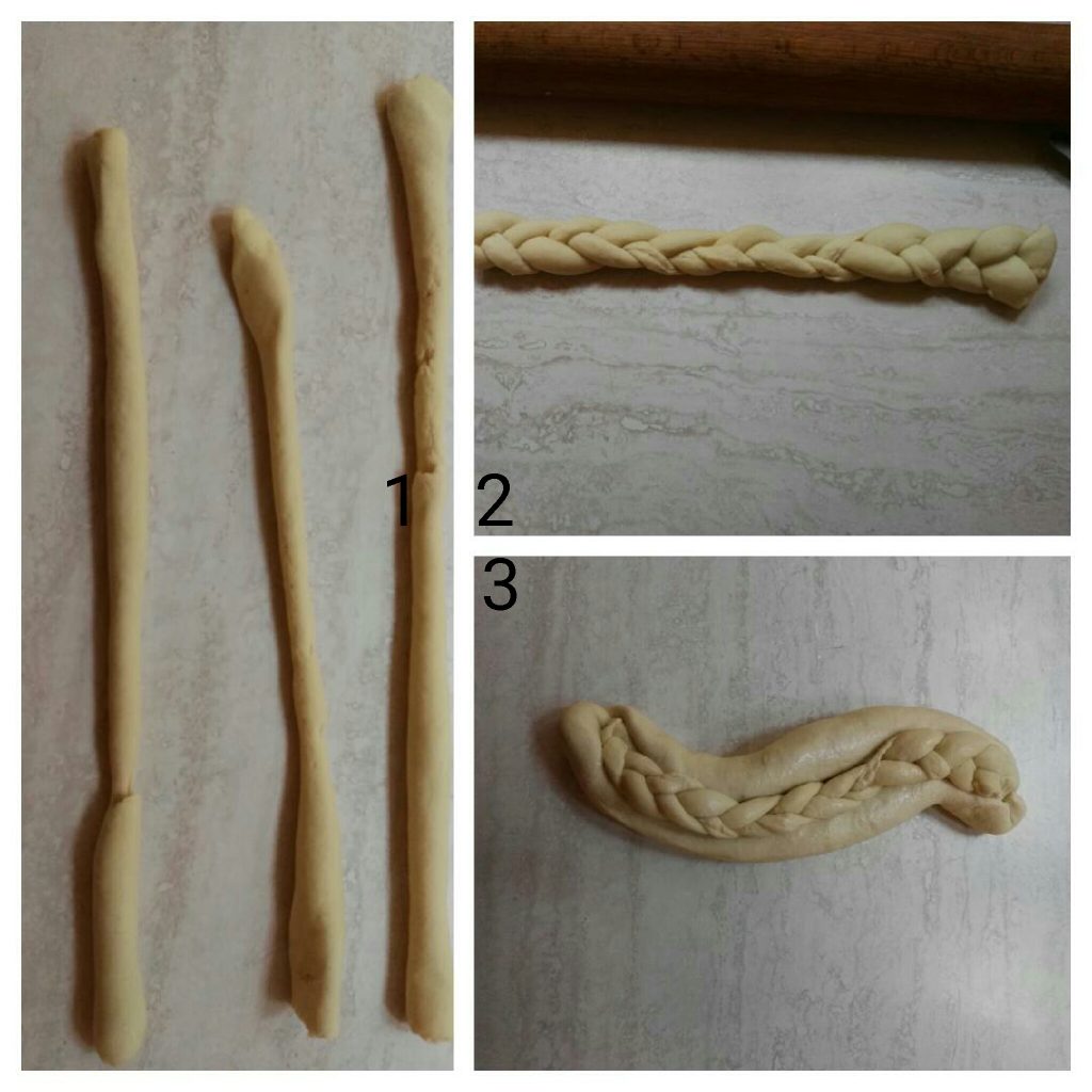 Maak een vlecht van deeg, bevochtig licht het stokbrood op de plaats van de vouw, leg de vlecht erop en modelleer in een “S“-vorm. Ga verder met de andere vormen die je op de foto ziet.