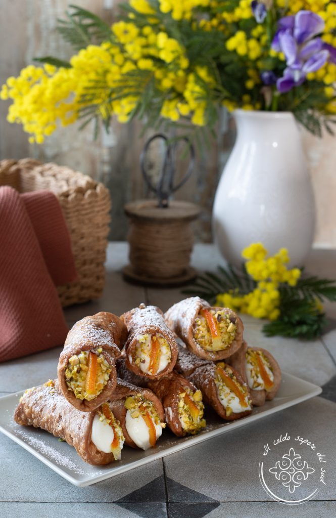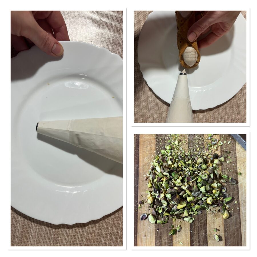 Vul een spuitzak en vül de cannoli vlak voordat je ze serveert; werk af met gehakte pistachenoten of pistachepoeder, wat gekonfijt vruchtvlees en bestrooi met poedersuiker en kaneel. Vul alleen zoveel als je denkt te gebruiken, want de schalen worden binnen enkele uren zacht door de vochtigheid van de ricotta en verliezen hun karakteristieke krokantheid.