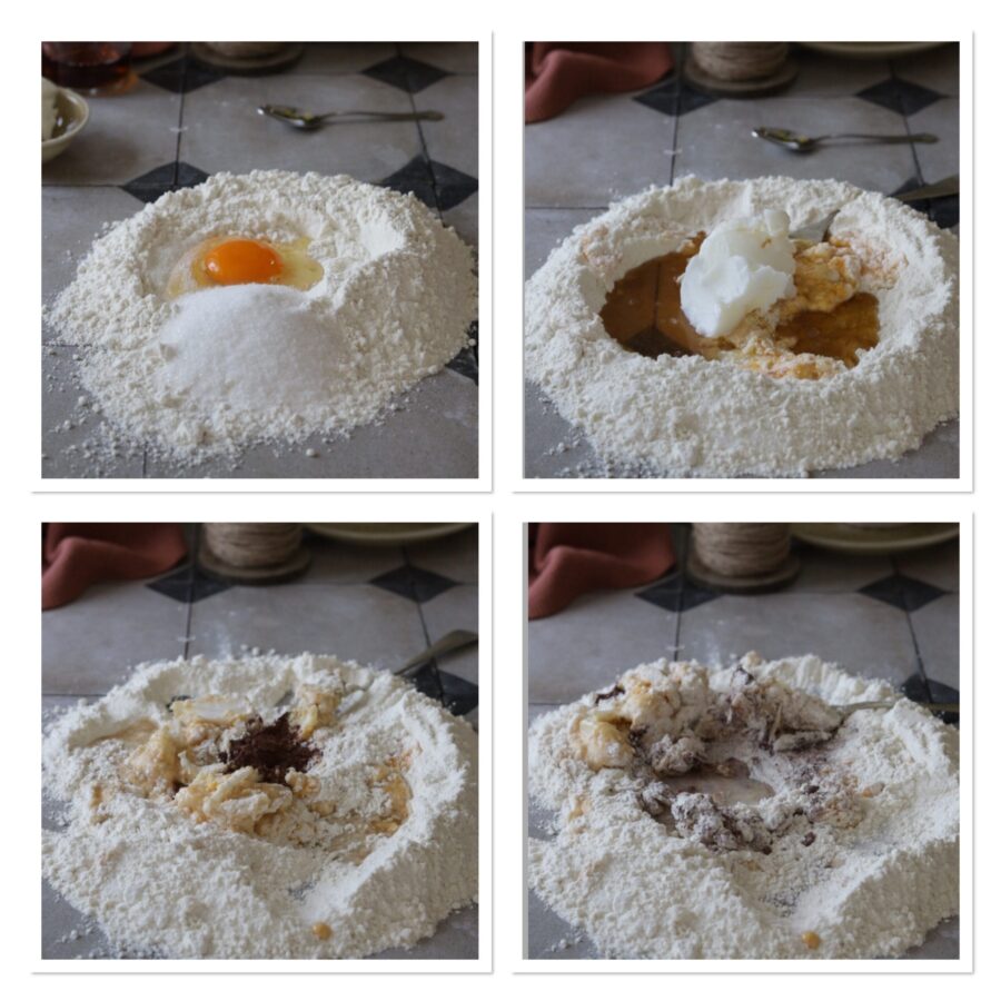 Om de schalen van de cannoli te maken, maak je op het werkblad een hoop bloem met een kuiltje, voeg het ei, de suiker en de reuzel toe. Meng grofweg en voeg daarna de azijn, de wijn en de cacao toe.