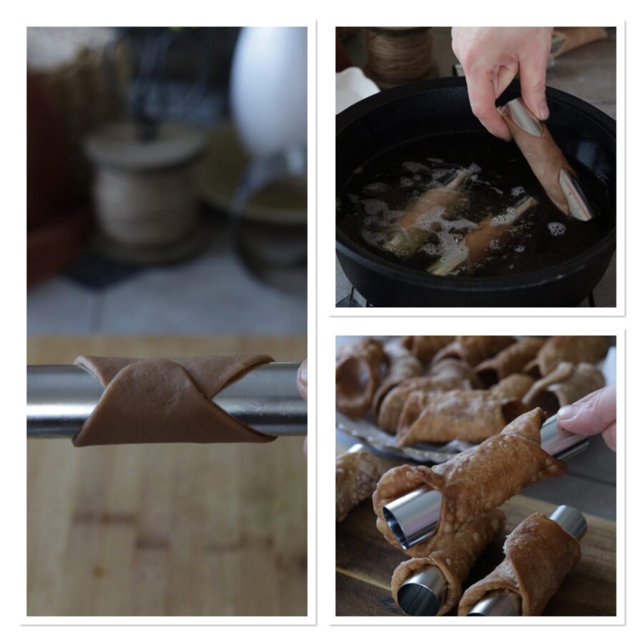 Frituur de cannoli in veel zonnebloemolie, draai ze regelmatig en houd de temperatuur onder de 180°C (de olie mag niet te heet worden en mag absoluut niet roken). Haal de cannoli uit de olie en laat ze uitlekken op keukenpapier; zodra ze afgekoeld zijn, laten ze zich gemakkelijk van de mal verwijderen.