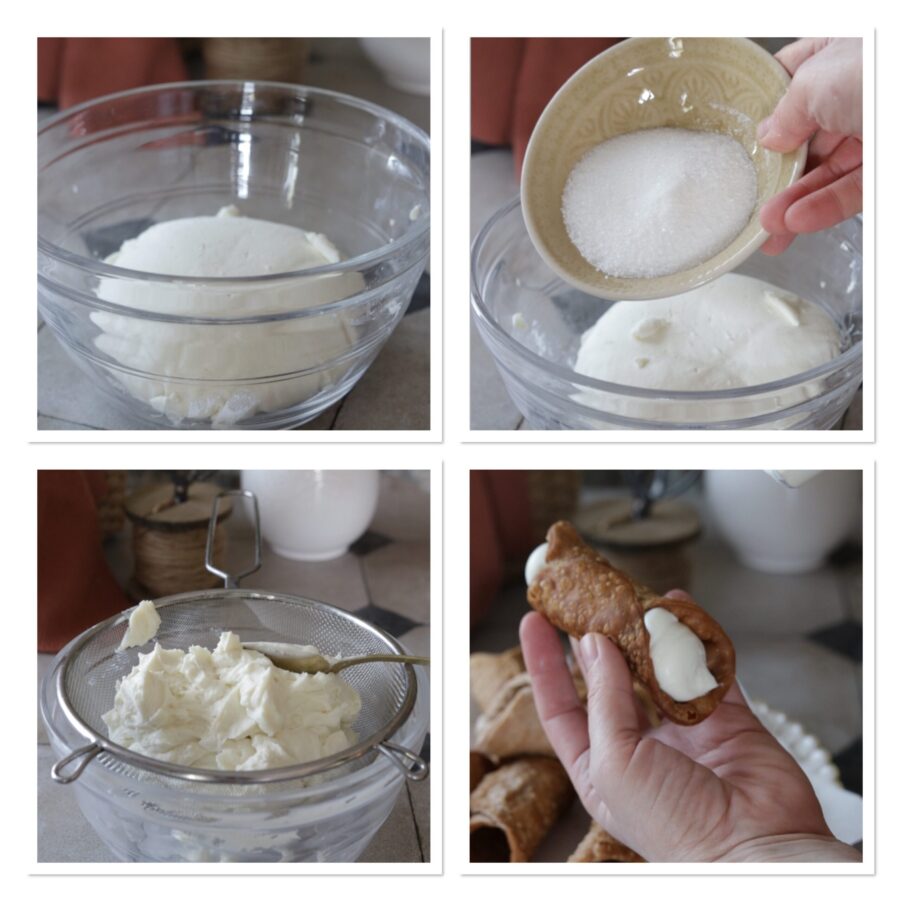 Voor het bereiden van de cannoli heb je een droge en goed uitgelekte ricotta nodig; begin daarom met minstens 1,6 g verse ricotta, verzamel deze in een katoenen doek, vorm er een pakketje van en leg het op een zeef die je boven een kom plaatst. Hoe droger de ricotta, hoe beter het resultaat; zet het in de koelkast en laat minstens 24 uur uitlekken, vervang de doek als deze te nat wordt of leg er een extra doek onder.