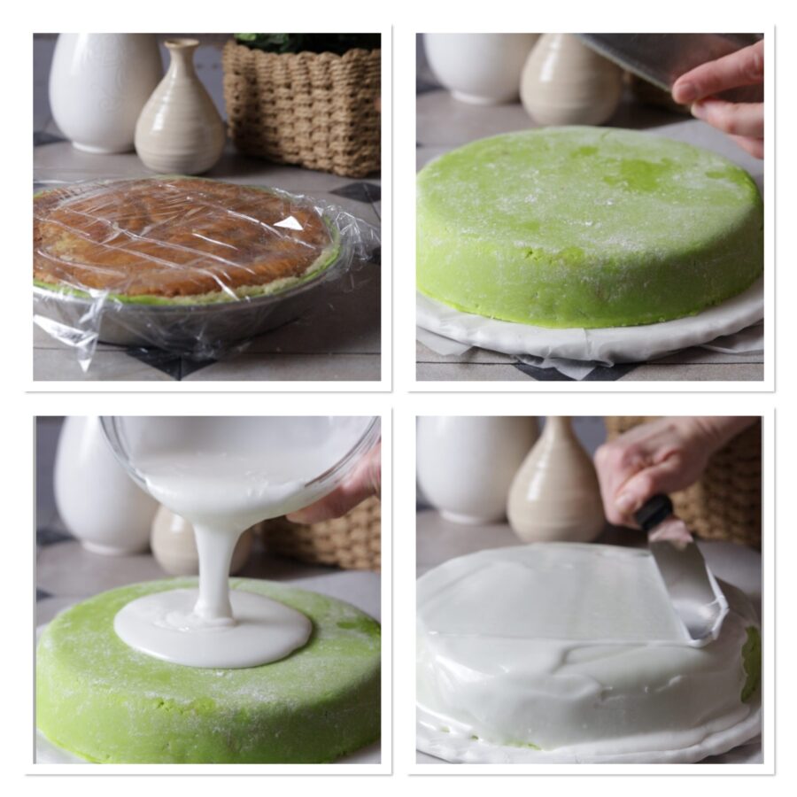 – Bereid een huisgemaakte glazuur door snel met een garde poedersuiker te mengen met zeer weinig water (ongeveer 300 g suiker en 35 g water), tot de juiste consistentie is bereikt zodat de glazuur de taart bedekt zonder volledig weg te lopen.