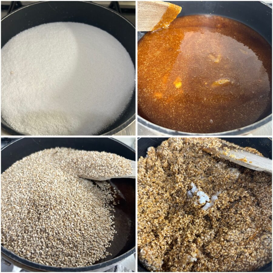 Als de karamel te warm wordt, zal de sesamtorrone te hard worden. Het is belangrijk het vuur uit te schakelen zodra de suiker een amberkleur heeft bereikt en het mengsel snel te verwerken.
