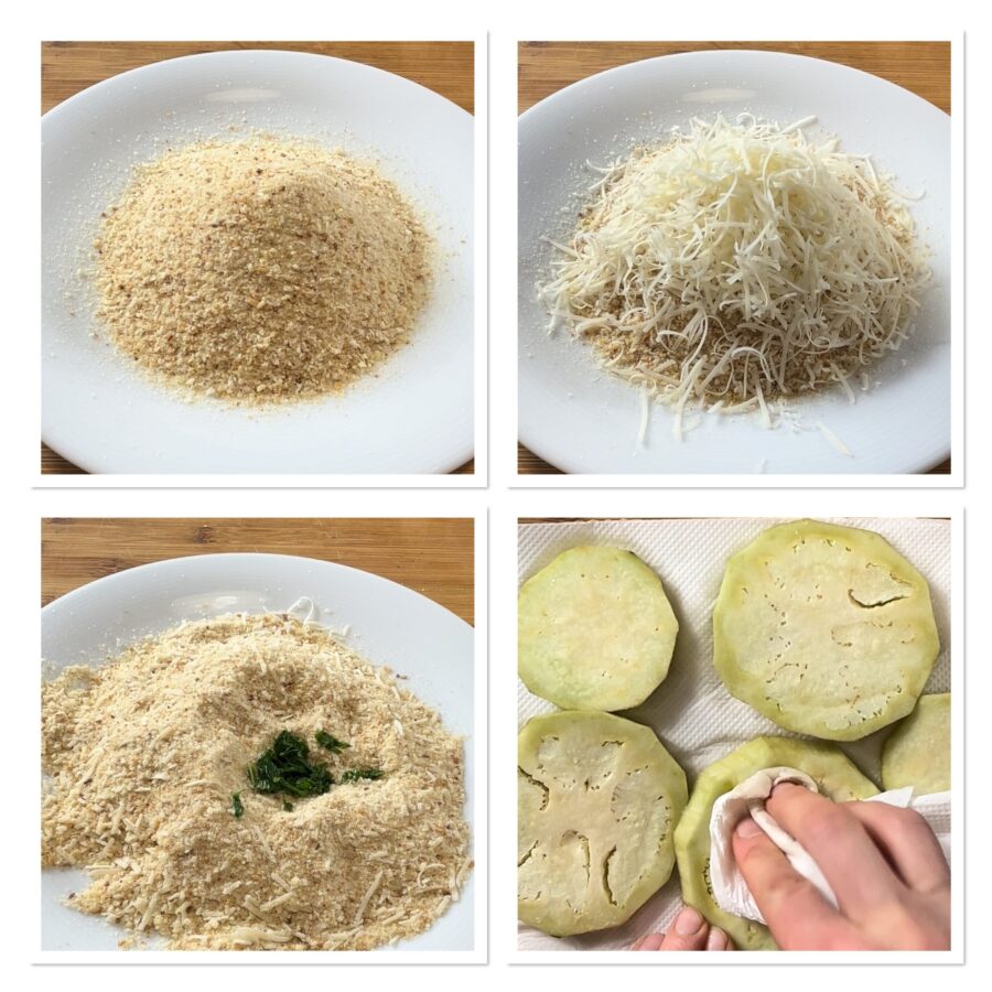 Bereid een paneerlaag voor met paneermeel en bijna alle geraspte kaas; je kunt Parmezaan gebruiken of voor een intensere smaak pecorino of caciocavallo. In ieder geval heeft gerijpte kaas de voorkeur. Meng en voeg de zeer fijngehakte peterselie en een snufje knoflook toe; meng tot een homogeen mengsel.