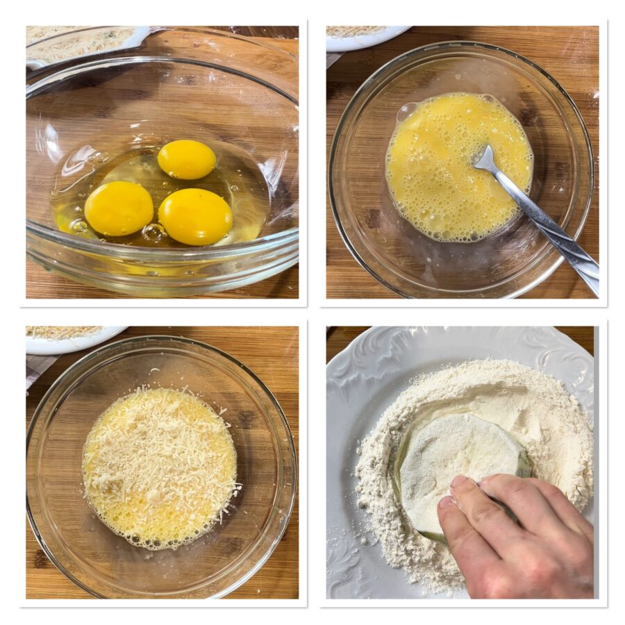 Klop de eieren los met de rest van de geraspte kaas en haal de plakken eerst door de bloem,