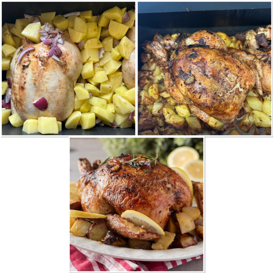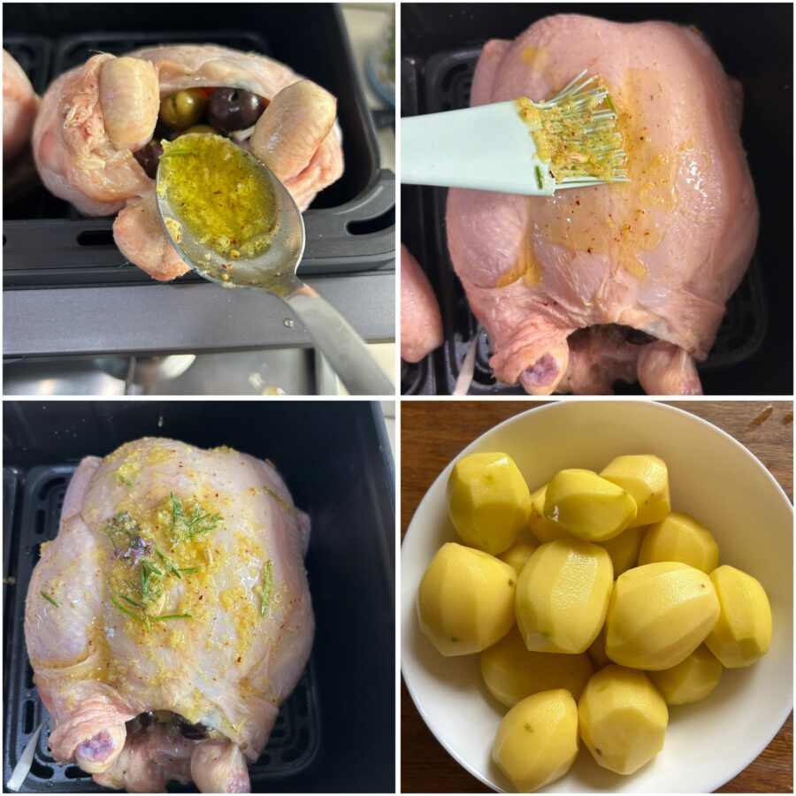 Aan het einde van de gaartijd is de kip mooi goudbruin, zacht en sappig, met aan de buitenkant knapperige en aan de binnenkant zachte aardappelen. Haal uit de oven en laat een paar minuten rusten voordat u aansnijdt. Ik heb zelf in een heteluchtfriteuse gekookt, die in feite een kleine oven is qua vorm en grootte, en ik heb tegelijkertijd twee kippen bereid door de hoeveelheden te verdubbelen. Voor kleinere heteluchtfriteuses zijn de tijden min of meer vergelijkbaar, maar let erop dat de kip niet verbrandt.
