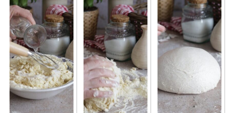 • meng in de kom, kneed een paar seconden met de hand en stort op het werkblad. Kneed lang zonder extra bloem toe te voegen, tot je een glad, elastisch en homogeen deeg hebt.