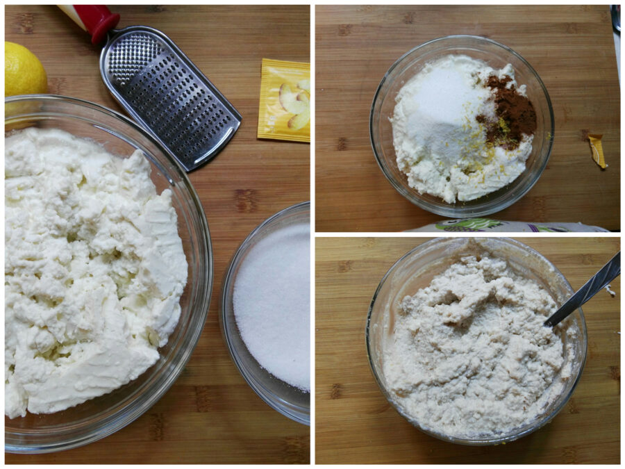 Doe de goed uitgelekte ricotta in een kom, voeg de suiker, kaneel, citroenschil en vanillesuiker toe en meng goed.