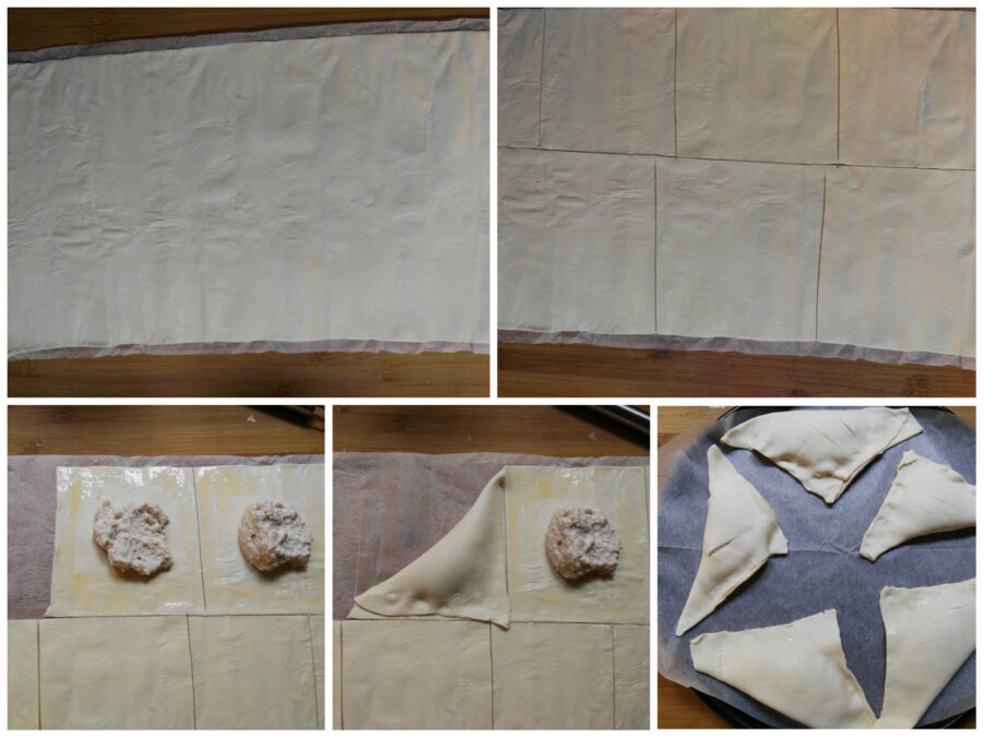 Rol het rechthoekige bladerdeeg uit en snijd zes vierkanten. Verdeel in het midden van elk vierkant een royale eetlepel ricottacrème. Bestrijk de randen van elk vierkant met het eimengsel waaraan je melk hebt toegevoegd en vouw ze vervolgens tot een driehoek.