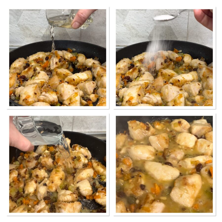 • Doe alle groenten in een zeer ruime pan met een royale scheut olie, voeg zout toe, bak ze en laat ze een beetje slinken. Voeg de ontzoute kappertjes, de rozijnen, de pijnboompitten en een paar ontpitte olijven toe — die ik helaas niet had. Als alles op smaak is, voeg je de kip toe die je eerder in de pan had gebakken.