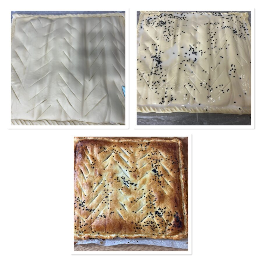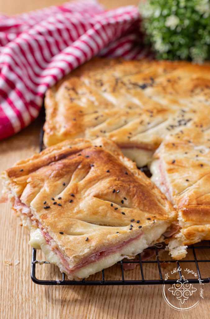 • Rol het bladerdeeg uit en besmeer het met de smeerkaas, dek vervolgens af met de plakken provola en daarna de ham. Bedek met een ander vel bladerdeeg en sluit de randen goed af.