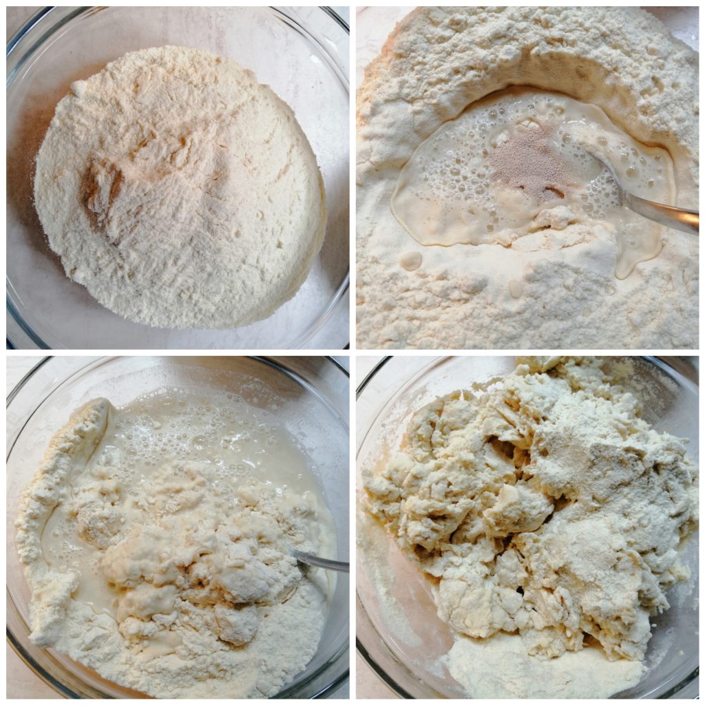 Doe de bloem in een kom, voeg de helft van het water toe en los daarin de gist op; als alternatief voor gedroogde gist kun je 6 g verse bakkersgist gebruiken.