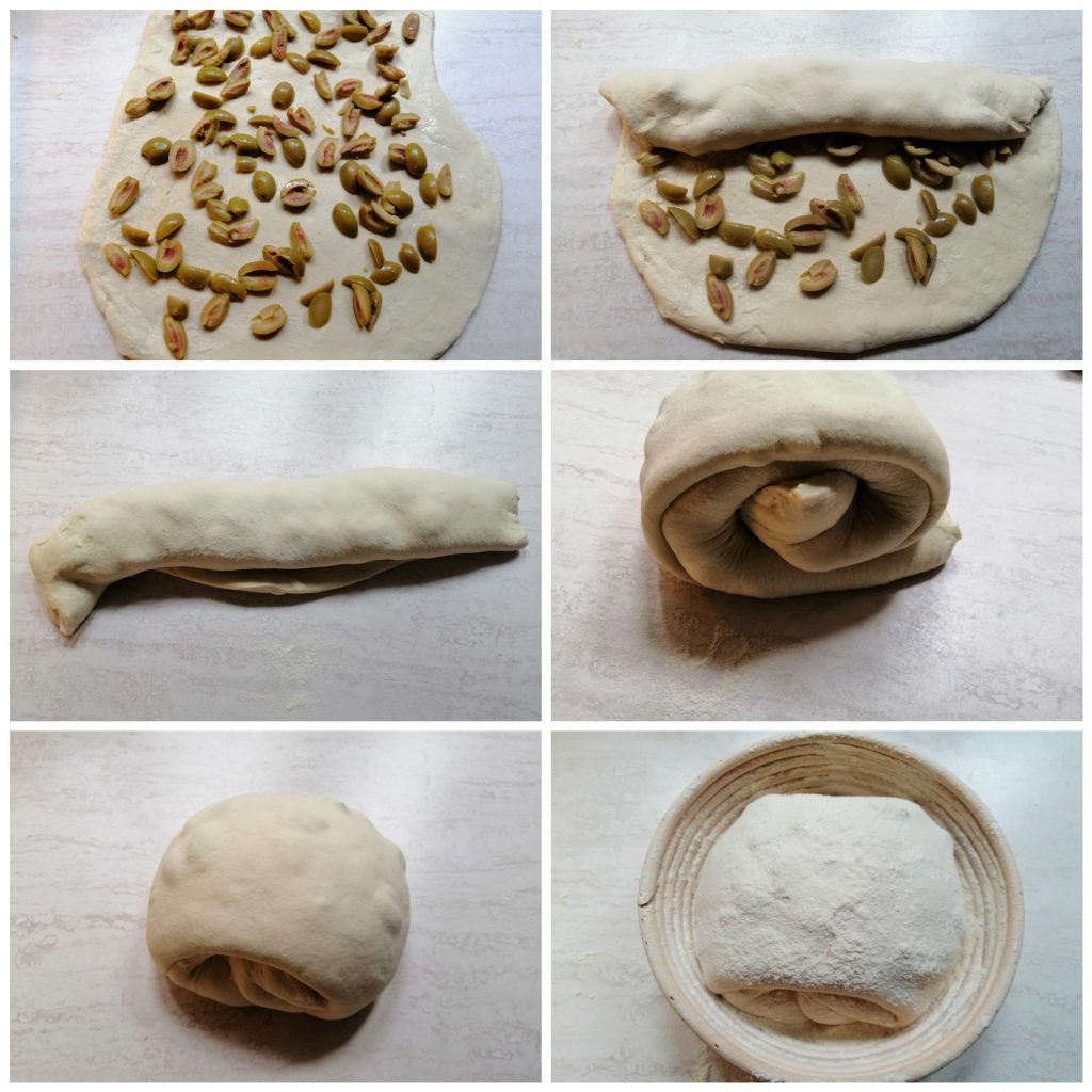 • Rol het deeg nogmaals uit tot een schijf, verdeel de olijven erover (je kunt de olijven kiezen die je het lekkerst vindt; ik had simpele groene olijven in pekel, maar zwarte of ingebakken olijven zijn heerlijk). Rol de schijf op tot een cilinder, rol vervolgens de cilinder op tot een slak en vorm met je handen een bol van de slak.